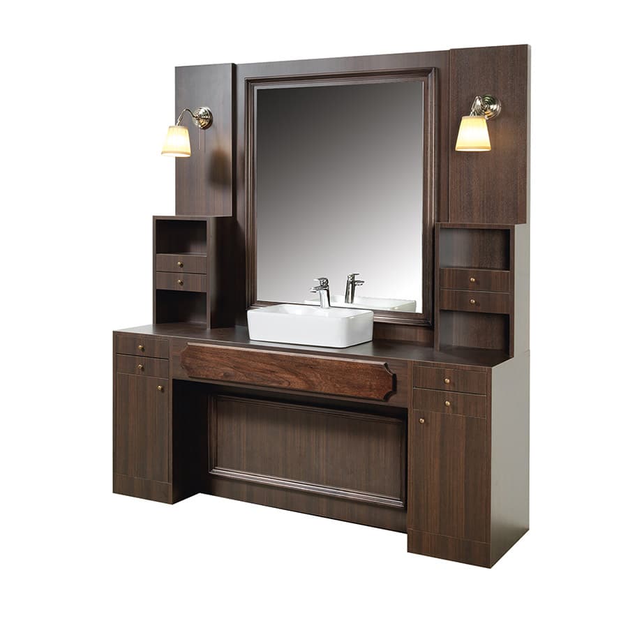 Notre poste de travail professionnel simple RETRO 2.0 a une structure en plastique stratifié avec une finition en bois naturel et un évier intégré, un groupe hydraulique et des lampes décoratives. Un meuble de style londonien qui rappelle les premiers salons de coiffure et s’intégrerait parfaitement dans un décor vintage.